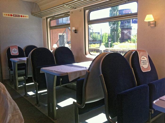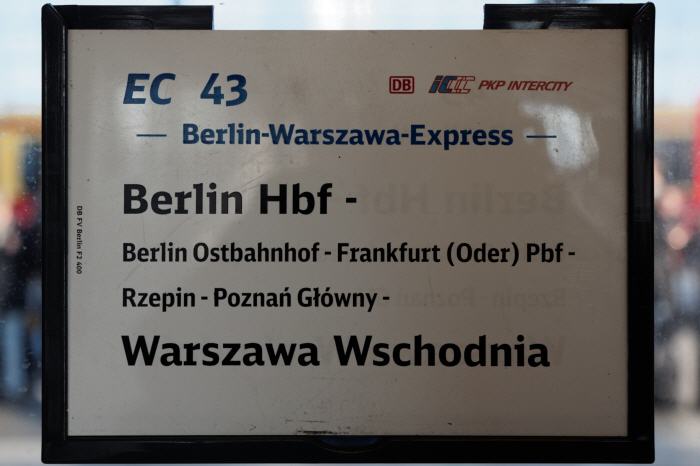Für diese Direktverbindung zwischen Berlin und Warschau beträgt die Fahrtzeit 5:30 Std. Ab Frankfurt (Oder) besteht Reservierungspflicht. Diese Verbindung besteht aus 4 Zugpaaren, d. h. ab jedem Startbahnhof gibt es täglich 4 Abfahrten. Die Züge werden mit Taurus Elloks von Siemens bespannt. Das Wagenmaterial besteht aus IC Wagen, jeder Zug umfaßt sechs Wagen (1 x 1. Klasse, 1 x Restaurant oder Bistro/1.Klasse, 4 x 2. Klasse). Die Wagen sind speziell lackiert: Grundfarbe weiß mit blauem Streifen und integriertem Schriftzug "Berlin-Warszawa-Express". Die Gastronomie wird von der polnischen Speisewagengesellschaft WARS bewirtschaftet. Hier wird noch "richtig" gekocht und nicht wie bei der Deutschen Bahn im Dampfgarer erwärmt. Ich empfehle einen Besuch: Die Preise sind moderat und es schmeckt hervorragend. Für das polnische Frühstück (Rührei mit Schinken, frischen Tomatensalat, Brot, Butter und Kaffee) habe ich rund € 7,00 bezahlt. Als Mittagsgericht habe ich ein Kotelett mit Beilagen (€ 6,80) gegessen, was erstklassig zu bereitet und geschmeckt hat.