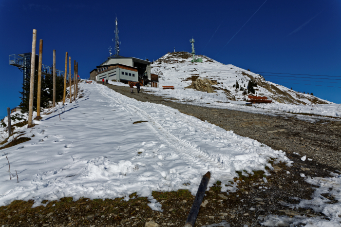 Für den ersten Teil des Abstiegs nehmen wir den Panoramaaufzug. Der jetzt beginnende Fahrweg ist gut befestigt und schneefrei. Der Weg liegt am sonnigen Südhang des Horns. Auffällig sind die unzähligen Lawinenverbauungen, die den im Tal liegenden Ort Baad schützen sollen. Nach kurzer Zeit kommt eine Weggabelung, wer möchte kann sich rechts halten und zur oberen Lüchlealp gelangen.
