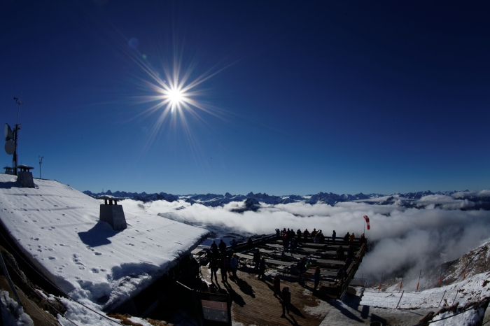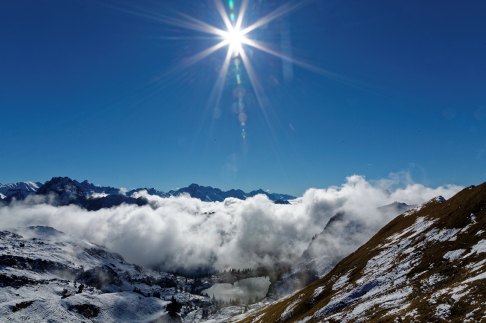 Heute ist unser absoluter Entspannungstag. Gegen 11 Uhr sind wir mit der Bahn auf das Nebelhorn gefahren. Über den Gipfeln ein sonniger, wolkenloser Himmel. Die Berggipfel sind teilweise mit Wolkenbändern umgeben. Traumhafte Fotokulisse.