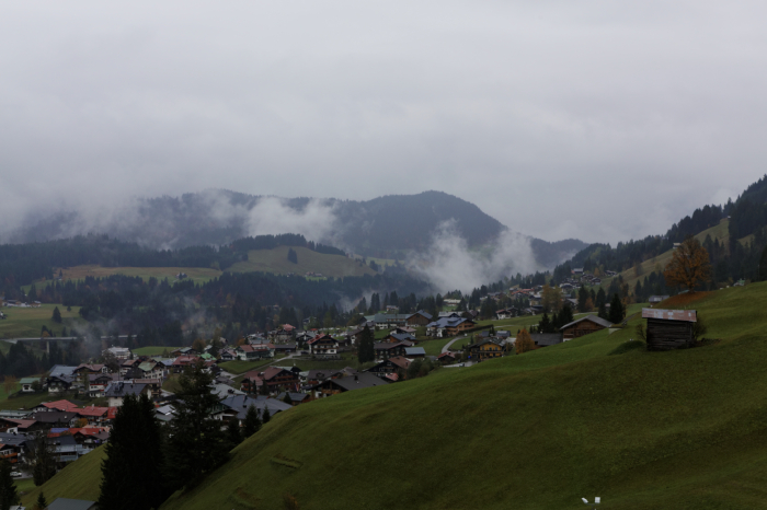 Die Wetteraussichten für heute: Bedeckt, teilweise leichte Schauer. Wir haben als Einstieg für die Wanderwoche eine Tour gewählt, die wir auch schon letztes Jahr gegangen sind: Ab der Bergstation der Söllereck Bahn in Richtung Riezlern. In Höhe der Bergstation ist der Boden mit einer Schneedecke bedeckt gewesen, wir hatten dazu leichten Schneeregen. Es ist eher ein Spaziergang, für den wir zwei Stunden benötigt haben. Die Spitzen der Berge waren in Wolken eingehüllt. Später hörte der Nieselregen auf. Im Verhältnis zum letzten Jahr auf diesem Weg haben wir fast keine anderen Wanderer getroffen. Der Weg ist gut befestigt und kann auch bei feuchten Bodenverhältnissen gut gegangen werden.