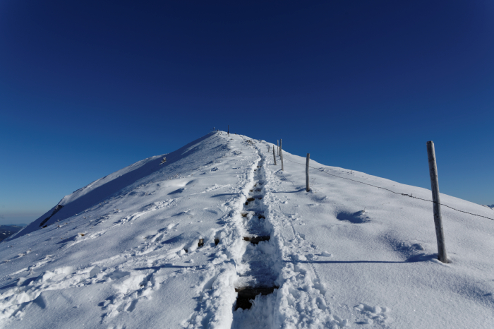 Es gibt hier oben einen geschlossene Schneedecke. Ein Trampelpfad führt uns zunächst zum Gipfelkreuz des Fellhorns. Nur wenige Besucher, die mit uns soeben in der Seilbahnkabine waren sind ebenfalls zum Gipfel gegangen. Jetzt wollten wir den Gratweg in Richtung Söllereck nehmen. Ein Wegweiser zeigte auf einen Weg der nur mit Mühe erkennbar war. Einige Fußspuren verrieten, das hier am Vortag Wanderer unterwegs waren. Just in dem Augenblick kam ein jüngeres Pärchen aus Richtung Söllereck. Wir erhielten die Auskunft das der Weg begehbar ist, aber man stellenweise bis zu 40 cm in den Schnee einsinkt. Die Spuren waren frisch und auf ging es. Dem war auch so zeitweise sind wir gut in den Schnee eingebrochen. Aber es lies sich mit Stöcken noch gut meistern. Dieser Weg ist ein absolutes Highlight. Links eine Aussicht in das Kleinwalsertal und den Ifen, rechts das Stillachtal mit Blick zum Nebelhorn. Erst nach rund 2 Stunden kamen uns Wanderer entgegen. Da würde ich schon sagen es wird zeitlich eng für diese. Zum Einen müssen sie stetig bergauf gehen und dann wird es noch knapp die letzte Talfahrt der Fellhornbahn zu erreichen. In Höhe des Söllereck beginnt der etwas steilere Abstieg hinunter zur Sölleralpe, die Schneegrenze wird hier erreicht. Bis auf einige glatte Stellen im Schattenbereich war der Weg gut zu gehen.