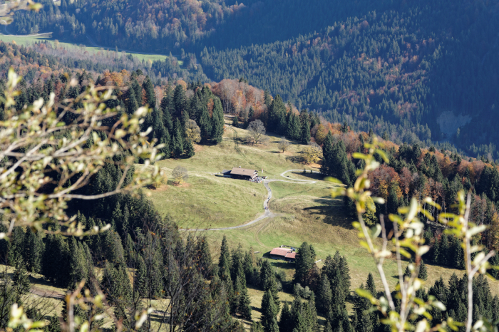 Die Mittelstation der Fellhornbahn hat eine nach Süden ausgerichtete Sonnenterasse. 10 bis 15 Besucher haben sich bereits gesonnt, bevor wir hier auch eine kleine Sonnenpause eingelegt haben. Nachdem wir an der Talstation angekommen waren sind wir zum zweiten Teilstück unserer heutigen Tour aufgebrochen: Ein fast auf einer Höhenlage liegender Wanderweg führt zur Schiflugschanze. Der gut befestige Fahrweg führt durch Wiesen und herbstlichen Laubwald und dauert wiederum eine gute Stunde.