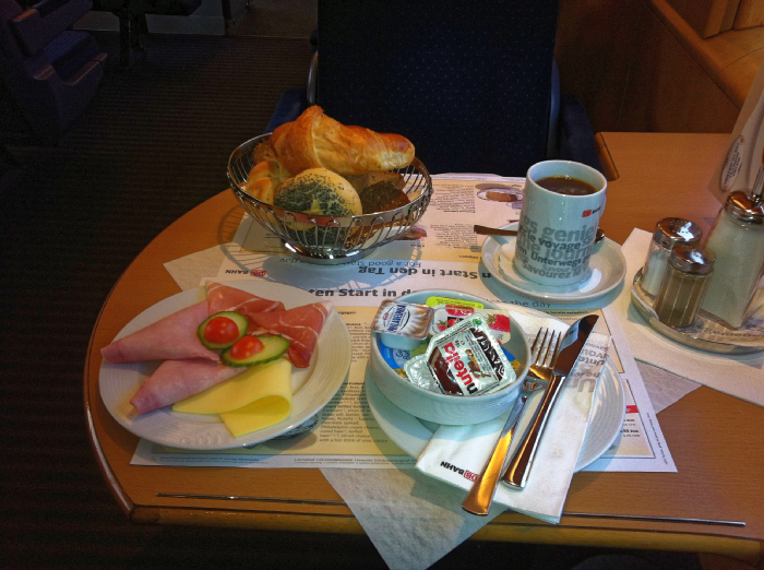 Der erste Umstieg erfolgte in Mannheim - ein doppelteiliger ICE 3 stand auf dem gegenüberliegenden Bahnsteif bereit. Da ich bislang noch nichts gegessen habe und in der Schweiz bekanntlich das Preisniveau etwas höher ist als bei uns, hatte ich vor zu frühstücken. Ich war der einzige Gast, konnte das auch gleich nutzen um den Bistrobereich abzulichten. Ein sehr freundlicher und zuvorkommender Kellner bediente mich. Ich wählte ein kombiniertes süßes/Wurstfrühstück für € 10,20, fast schon zu viel für mich aber ich habe langsam gegessen und habe das Restaurant erst in Freiburg verlassen. Während es im Raum Karlsruhe noch geschneit hatte, war in Freiburg nicht ein wenig Schnee zu sehen. Dieses ist auch meine erste Fahrt durch den 9,4 km langen Katzbergbergtunnel (zw. Freiburg und Basel), der Ende letzten Jahres in Betrieb genommen worden ist.