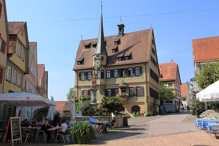Bietigheim-Bissingen wird nach knapp zwei Stunden Fahrzeit erreicht. Ein modernes, kaltes Gebäude empfängt den Bahnreisenden. Direkt auf dem Bahnhofsvorplatz beginnt der sehr gut ausgeschilderte Weg in die historische Innenstadt. Nach ein paar hundert Metern verläuft die Enz parallel zum Fußweg. Das bekannte Enzviadukt, welches man unterquert ist unübersehbar. Dieses bietet schöne Motive für den Eisenbahn interessierten Amateurfotografen. Auf der Wiese unter dem Viadukt gerade die Schausteller ihre Fahrgeschäfte und Buden für den Pferdemarkt aufgestellt hatten, habe ich selbst keine Bilder dort gemacht. Am Weg direkt am Viadukt gelegen ist der Paulaner Biergarten. Ich habe auf dem Rückweg dort gegessen und kann dieses Lokal empfehlen.