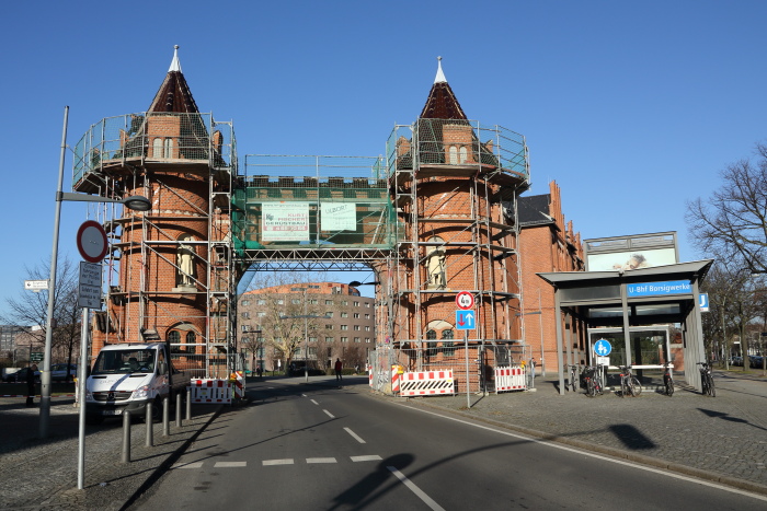 Ausstieg in der Station Borsigwerke: Direkt am Ausgang befindet sich das Borsig Tor, leider aufgrund von Restaurierungsarbeiten eingerüstet. Heute findet man auf dem ehemaligen Borsiggelände ein großes Einkaufszentrum, nur ein kleines Denkmal hinter dem Tor erinnert noch an die frühere Produktion von Eisenbahnlokomotiven. Vorbei am Borsigturm, einer Hallenruine hat es mit zum Tegeler See geführt - eine angenehme Ruhe abseits vom Stadtzentrum, wäre da nicht der Flughafen Tegel.