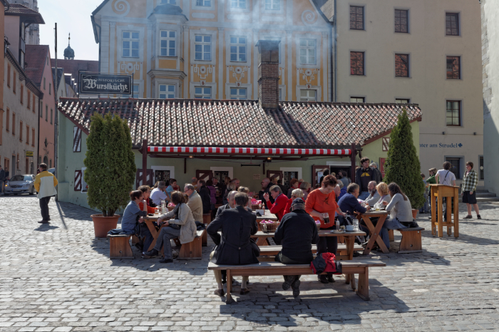 - Weiter in die Goliathstraße in Richtung Donau. Direkt an der Steinernen Brücke befindet sich die Historische Wurstküche. Leider ist ist so, das aufgrund der Lage das Stadtzentrum stets im Gegenlicht liegt.