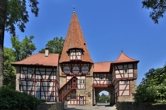 Ein wolkenloser Himmel empfing mich am Zielbahnhof. Markant sind in Bahnhofsnähe die großen Werkhallen von der Fa. Knauf (Gips). Diese sind mir früher schon bei der Durchfahrt mit dem ICE aufgefallen. Der Bahnhof liegt etwas außerhalb des Ortszentrums, 10 min Fußweg sind es bis zum Beginn der Stadtmauer. Auf dem Weg vorhin ist linkerhand ein Edeka und Penny Markt, wo man sich bei Abfahrt mit Reiseverpflegung eindecken kann.