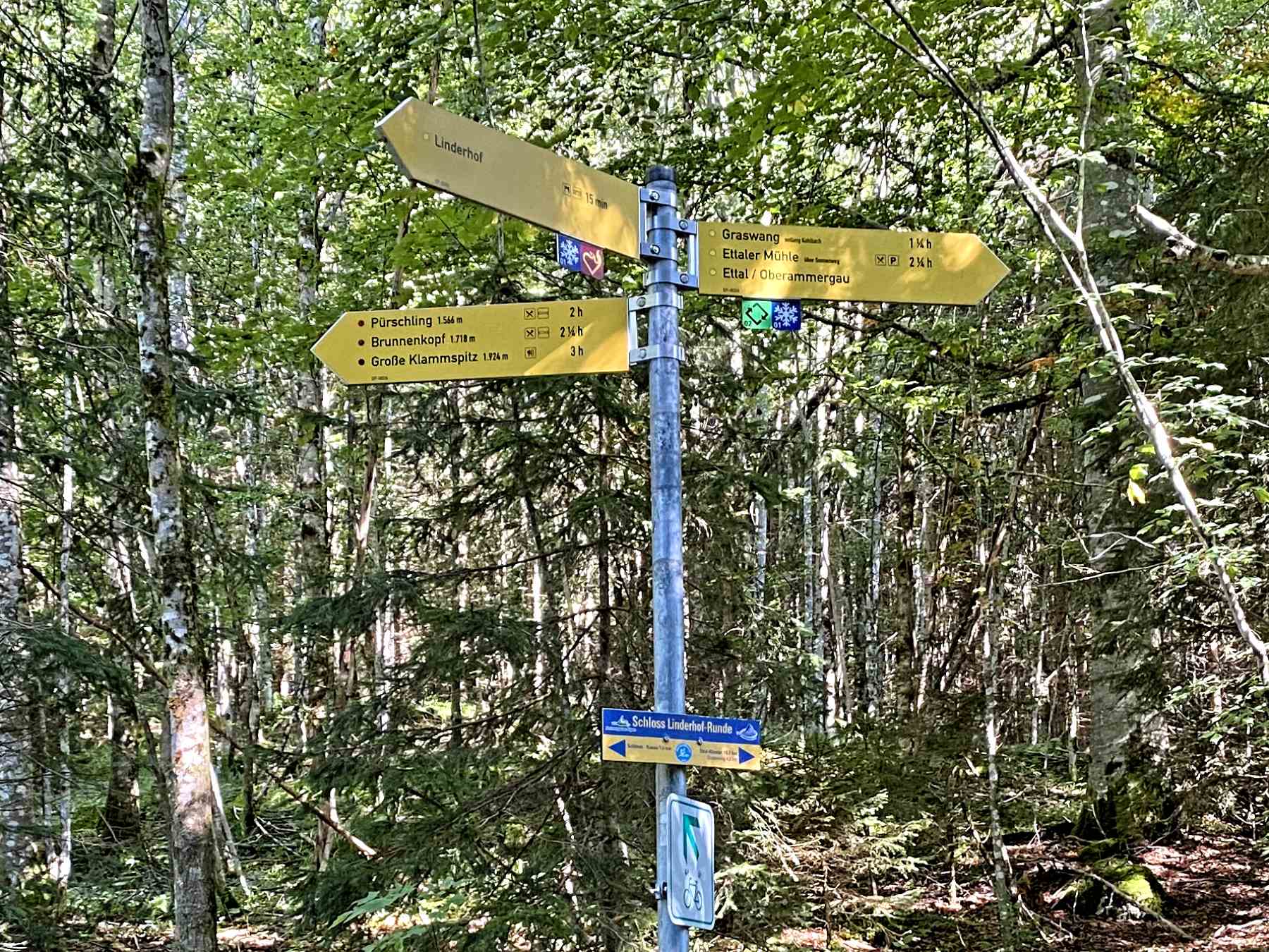 Die Wanderung kann man am besten vom Maurischen Kiosk (Plan Nr. 24) aus beginnen. Von dort aus ein kurzes Stück talwärts, dann links in den nicht ausgeschilderten Weg, welcher vorbei an der ehemaligen Bauhütte (Plan Nr. 25) führt. Nach ein paar Minuten Gehzeit werden die Schlossanlagen durch einen Nebeneingang verlassen - nun der Forststraße nach rechts folgen (Wegweiser Graswang, Ettaler Mühler, Ettal - Bild 07).